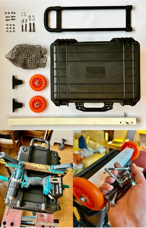 At the local second-hand store, I found a cheap broken Ikea suitcase, from which I salvaged the retractable handle. As you can see from the photo, it was a magically perfect fit. My good friend Billie had some wheels lying around and donated those for my project. The wheels were joined to the case with an old table leg, and everything was bolted together for easy future repairs.