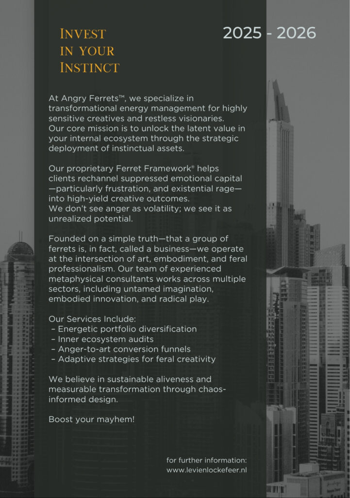 I learned that a group of ferrets is called a 'business'. The ferrets incorporated themselves overnight, and before I knew it, there was a Business of Angry Ferrets. They helped me understand how my creative impulse should be directed towards making things 'for real'. The first project in this new flow was the flyer for our new company. You may have found one laying somewhere out there in the 'real' world.